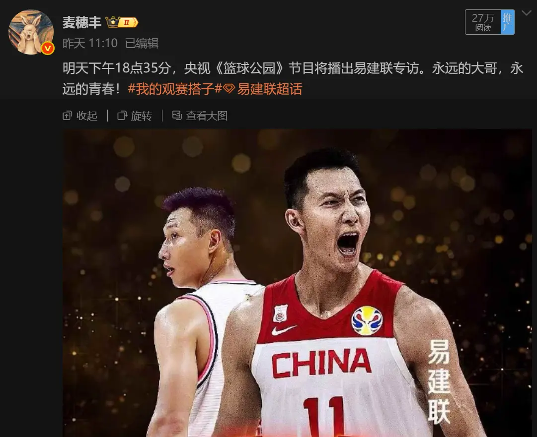 据知名篮球记者麦穗丰报道,今天下午的18点35分,中央电视台的《篮球公园》节目要播出易建联的专访。这算是一个重要的信号,说明易建联终于逐渐走出了舆论风暴,可以回到公众的视野范围内。